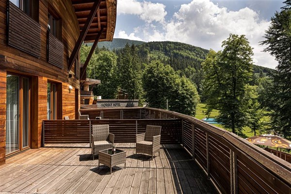 Součástí ubytovacího komplexu je hotel, samostatné apartmánové domy a dva horské domy.V areálu je recepce, restaurace s moderní domácí a mezinárodní gastronomií, lobby bar, letní terasa, dětský koutek, Wi-Fi připojení, úschovna kol a servis kol, víceúčelové hřiště, dětské hřiště, venkovní bazén, parkoviště, kongresové centrum.K zapůjčení sezónní sportovní vybavení (horská kola, hole nordic walking, lyže), společenské hry pro děti i dospělé, v zimním období je k dispozici úschovna lyží včetně vysoušeče bot a ski servis.Do hlavní hotelové budovy je zajištěn bezbariérový přístup a v hotelu je jeden bezbariérový pokoj.Wellness & Spa (v samostatné budově) – finská sauna, infrasauna, whirlpool, Kneippův chodník, masáže (klasická, relaxační, lávovými kameny, havajská, bambusová), rašelinový obklad, parafín, perličkové koupele.Zařízení je certifikováno dle oficiální jednotné klasifikace ubytovacích zařízení České republiky v HOTELSTARS.EU jako HOTEL****. Více informací o certifikaci najdete ZDE.