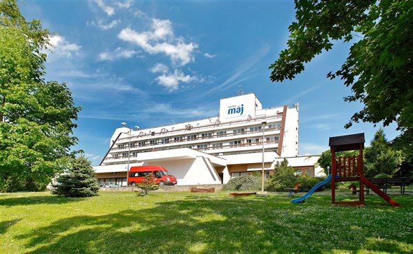 recepce, restaurace lázeňského typu, relaxační salonky (zimní zahrada, čítárna), kavárna s terasou (2x týdně živá hudba – taneční večery) a banketovou místností, bowling se 2 drahami, klimatizovaná fitness místnost, herní místnost: stolní tenis, biliár, el. šipky, stolní hokej a stolní fotbal. Půjčovna kol a elektrokol.Balneoprovoz: terapie přírodními zdroji (minerálně-sirné), masáže klasické i speciální, vodoléčba, zábaly, elektroléčba, ultrazvuk magnet, fototerapie, fyzioterapie, léčebný tělocvik, krytý relaxační bazén (6 x 10 m, hloubka 1,50 – 1,30 m, teplota vody 30 °C – 33 °C) -vhodný i pro plavání batolat a malých dětí. Bazén je spojen s letní sluneční terasou s lehátky a slunečníky a nabídkou osvěžujících nápojů. NOVINKA 2024: VŠECHNY pokoje hotelu Máj jsou vybaveny INDIVIDUÁLNÍMI klimatizátory (tedy žádná centrální klimatizace).Používání k topení či chlazení je pro klienty zahrnuto v ceně pobytu. Klimatizována je také hotelová hala, restaurace, kavárna, Zimní zahrada a čekárna Relax centra.Došlo také ke zkrášlení prostor hotelu:- restaurace a recepce jsou pokryty novým kobercem- nová skleněná příčka mezi halou a restaurací sjednotila design vstupních prostor- nový design mají chodby 2 a 3 patra- redesignem prošly koupelny obou apartmánů a koupelny původně bezbarierových pokojů